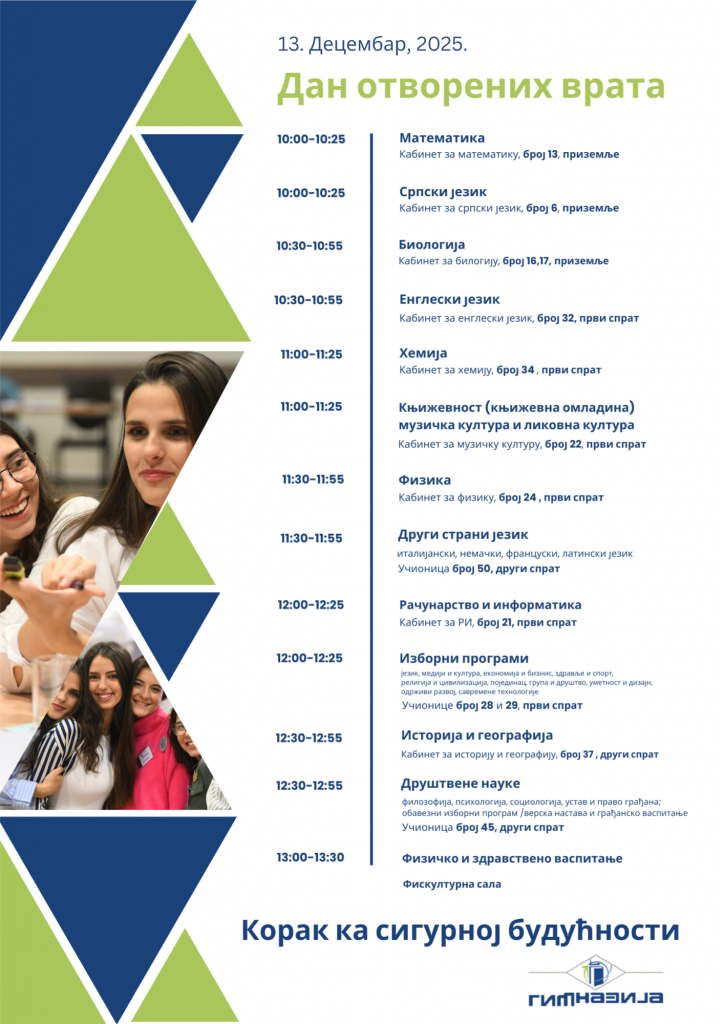 Pozivamo vas da u subotu, 13. 12. 2025. godine, posetite Gimnaziju i upoznate se sa radom i nastavnim kadrom naše škole.